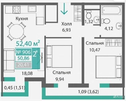 Площадь от 52.4 м2