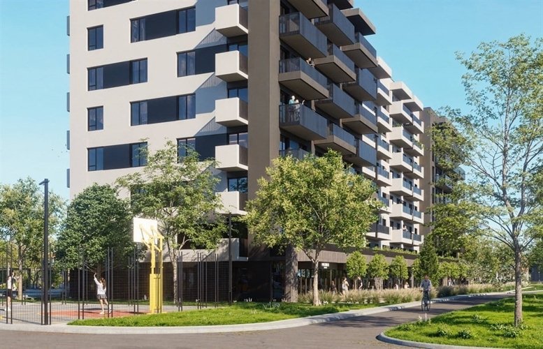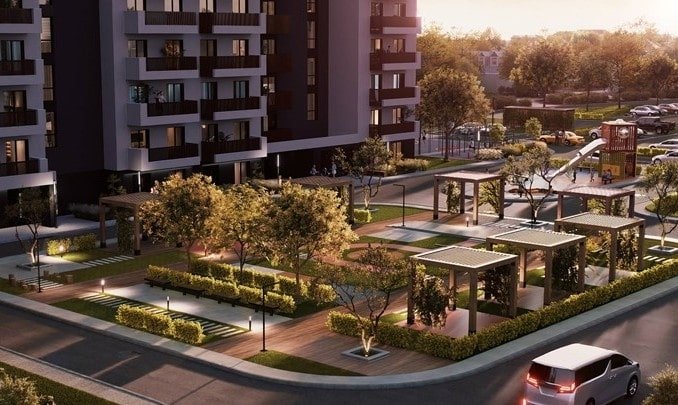 Зоны для спорта с тренажерами и детские площадки с безопасным покрытием, горками, качелями