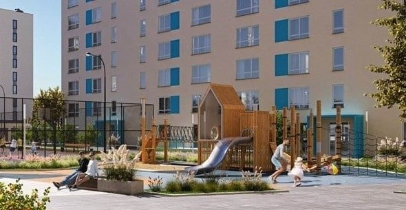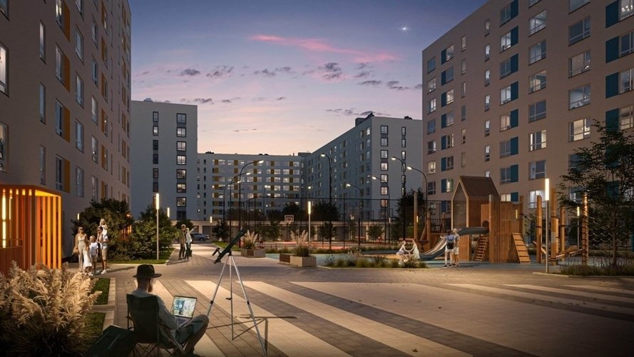 Первый этап — четыре монолитно-каркасных девятиэтажных дома в современном стиле, где элегантная колоннада между зданиями словно обрамляет территорию, замыкая ее в уютном объятии и обеспечивая ощущение защищенности. Парковки вынесены за пределы двора, предлагая достаточно мест для авто.